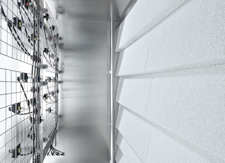 Система форсунок низкого давления обеспечивает мелкодисперсное распыление воды в поток воздуха в направлении к керамическому каплеотделителю. Влага, которая не была ассимилирована воздухом сразу, попадает на каплеотделитель. По мере прохождения воздуха через керамические кассеты, остаточная влага абсорбируется воздухом, обеспечивая высокую эффективность использования воды и бескапельное увлажнение.